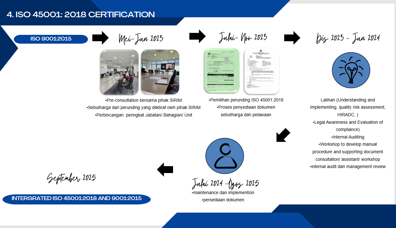 Pada Julai 2024 sehingga Ogos 2025, merupakan proses akhir pelaksanaan serta penyediaan dokumen kearah pensijilan ISO 45001:2018.