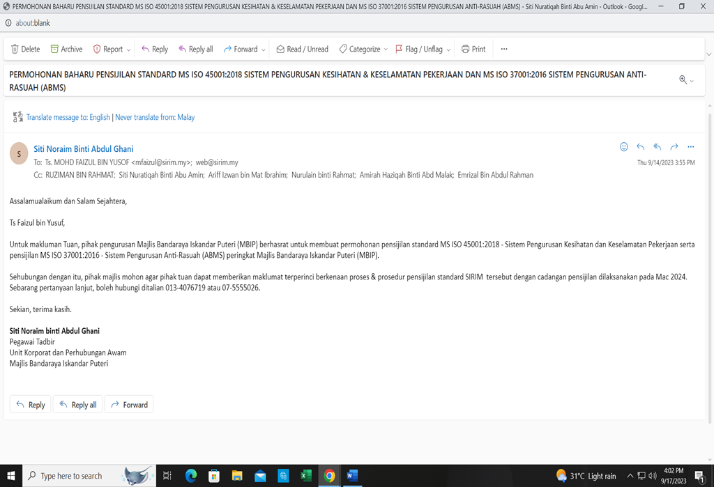 Sesi pengauditan kali ini diketuai oleh Ts Mohd Faizul Yusof, ketua juruaudit bersama Encik Mohd Shahril Mohd Arshad dan Cik Nur Amira Amran dari SIRIM QAS International Sdn Bhd. Pensijilan semula Sistem Pengurusan Kualiti MS ISO 9001:2015 berjaya dilaksanakan seperti mana prosedur standard Sistem Pengurusan Kualiti MS ISO 9001:2015 MBIP dengan baik dan cemerlang selari dengan teras perkhidmatan kepada pelanggan & pihak berkepentingan untuk menjadi sebuah Bandar Raya Pintar, Mampan dan Sejahtera dan pihak juruaudit mengesyorkan pensijilan MS ISO 9001:2015 Majlis Bandaraya Iskandar Puteri disambung sijil bagi tiga tahun.