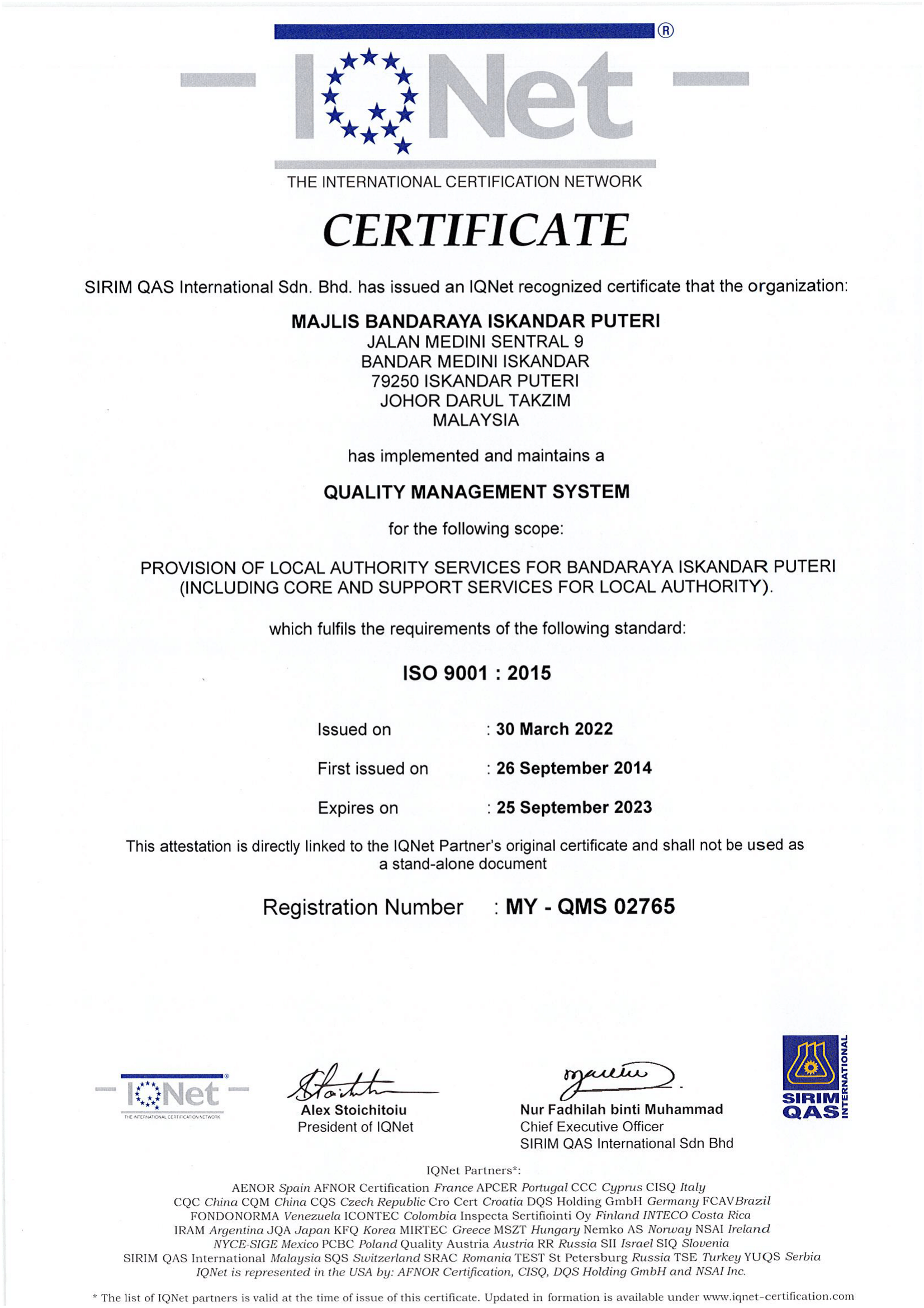 Pensijilan ISO 9001:2015 Sistem Pengurusan Kualiti Majlis Bandaraya Iskandar Puteri (MBIP) tamat pada 25 September 2023. Justeru itu, Majlis Bandaraya Iskandar Puteri (MBIP) telah mengadakan Audit Pensijilan Semula Sistem Pengurusan Kualiti MS ISO 9001:2015 yang telah berlangsung selama 3 hari bermula pada 4 hingga 6 September 2023 bertempat di Pejabat MBIP Medini.